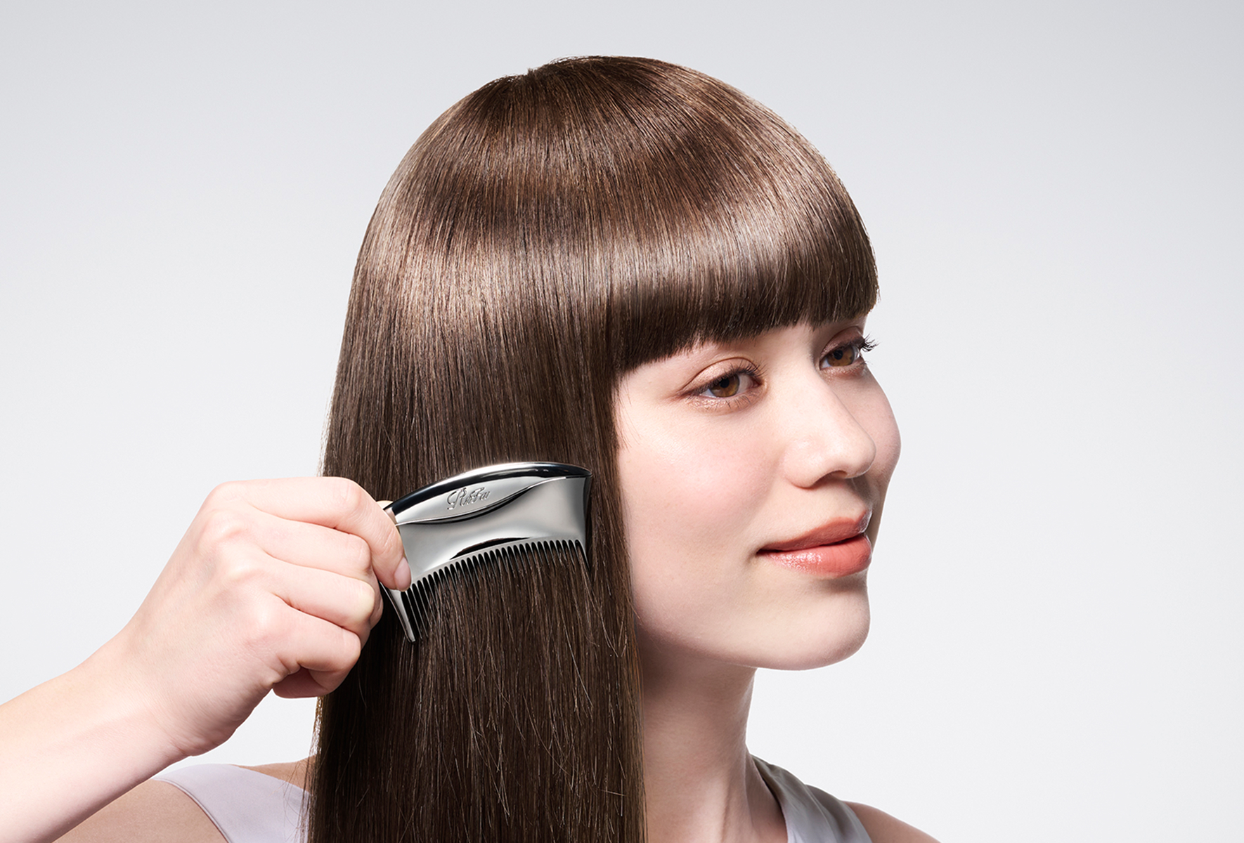 動くたびに光が流れる、きらめく髪へ。
