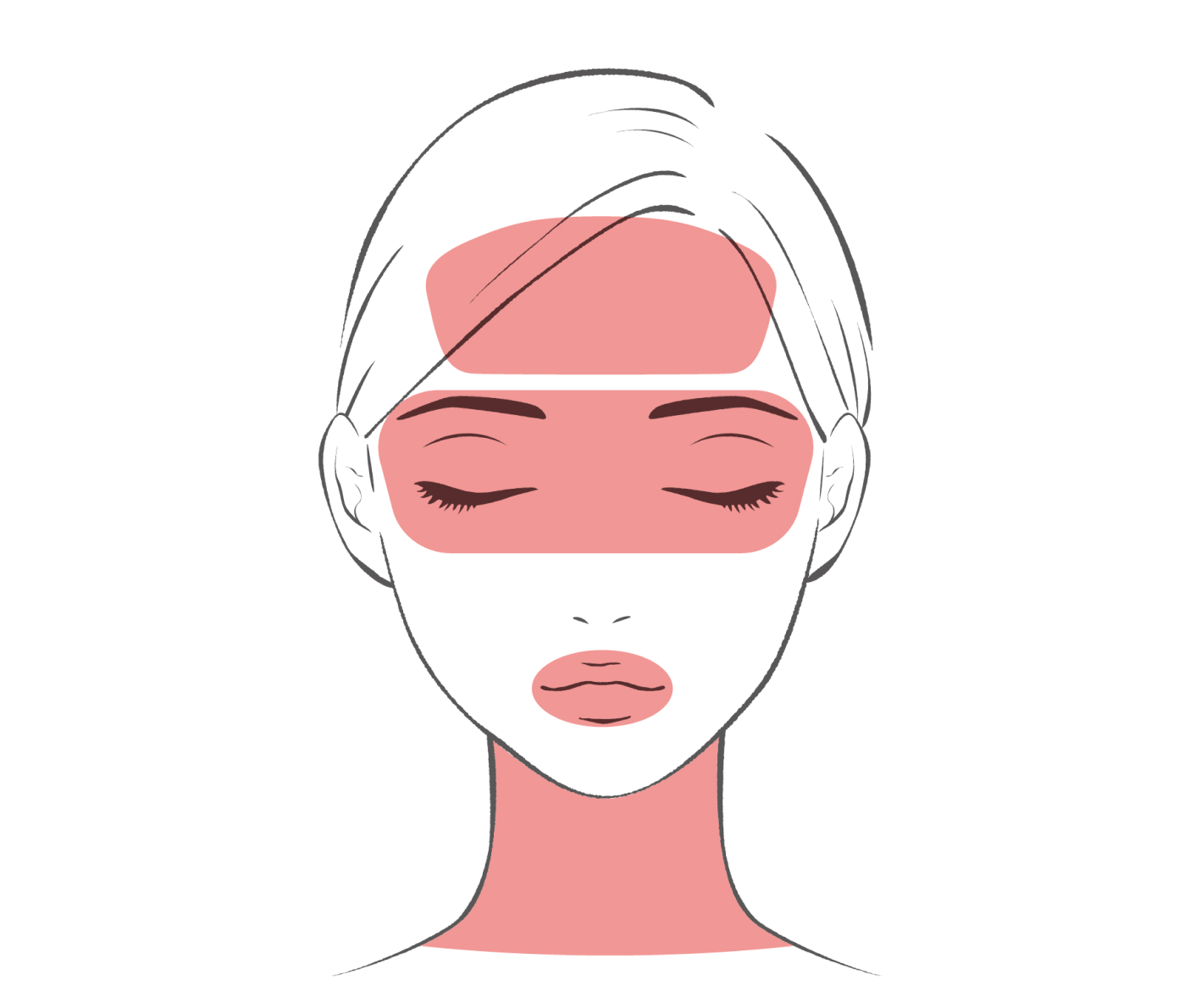 Head, forehead, temples, areas around the eyes, neck, chest area around the heart, narrow areas such as fingers and Achilles tendon