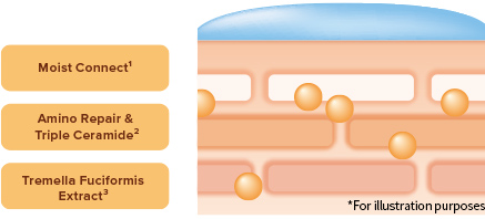 Formulated with Moist Connect,1 which locks in moisture; Amino Repair/Triple Ceramide,2 which help protect the skin and support its barrier function; and Tremella Fuciformis Extract,3 which retains skincare ingredients on the skin's surface and supports their absorption.4