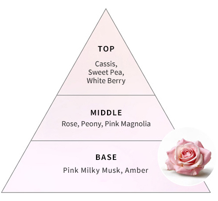 A harmony of happiness-bringing fragrance that combines the soft pink florals of rose and sweet pea, which exude delicate beauty, with translucent white berries and elegant white magnolia. It has a sweet and sour floral note with milky musk and amber, creating a gentle resonance.
