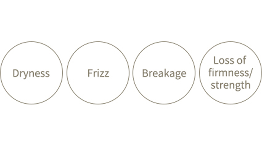 roughness from dryness, UV rays, and salon processes; frizz from heat damage;