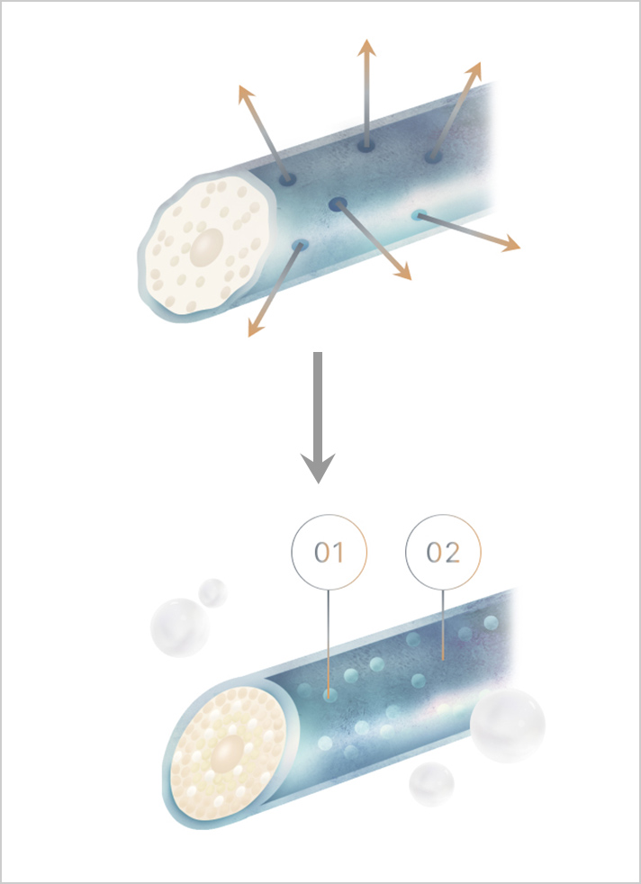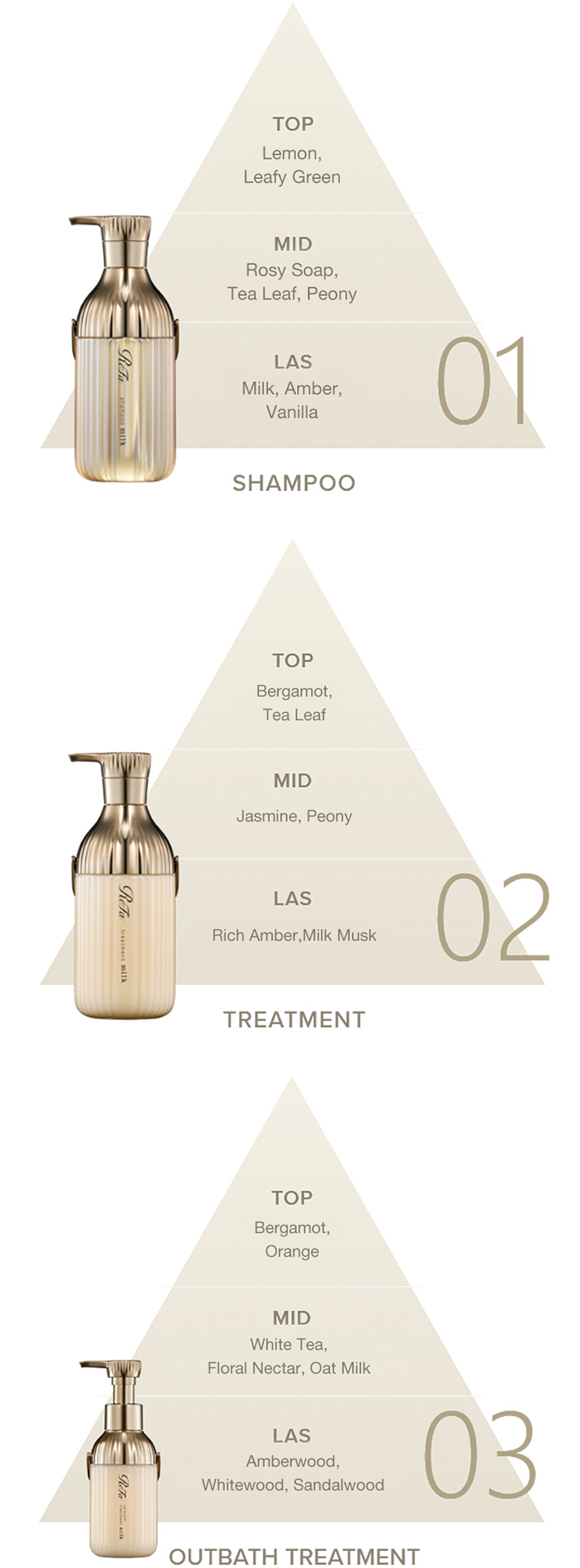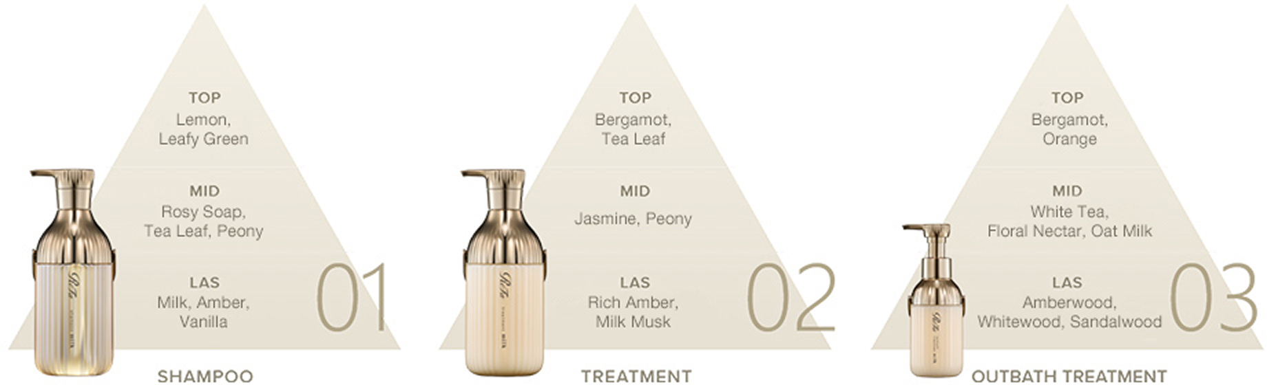 Each product in the line —shampoo, treatment, and Outbath (leave-in) treatment — features a unique amber-based fragrance. When layered, notes of bergamot, tea leaf, jasmine, milk, and musk intertwine, creating a sophisticated, elegant aroma. With the series’ longest-lasting formula, the scent leaves a memorable impression that lingers all day.