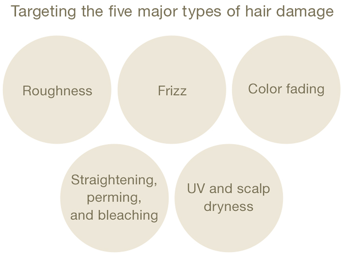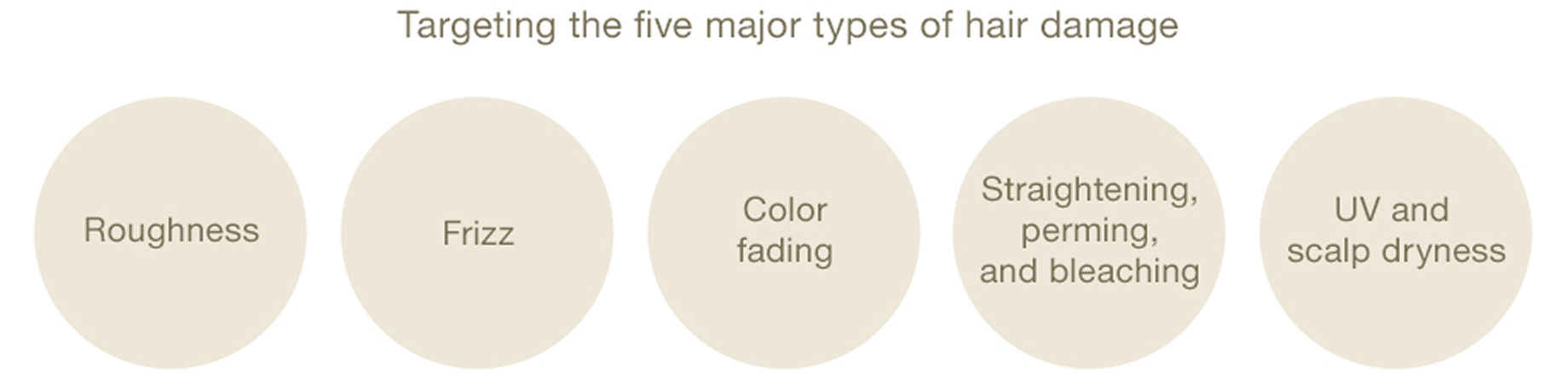roughness from dryness, UV rays, and salon processes; frizz from heat damage;