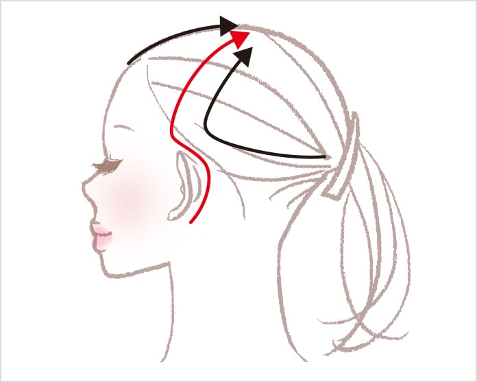 指の腹で軽く圧をかけ、赤線を意識して頭頂部へ流します。