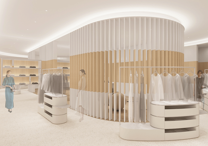 ReFa VITALWEARの温かみを柔らかな杢素材と優美な曲線で象徴的に表現したフロアです。ReFaブランドが新たに展開するブランドライン「ReFa VITALWEAR」の第1号店としても位置づけられ、ルームウェア、インナーウェアに加え、スリープウェアがもたらす心ほどける着心地を肌で実感いただけます。また新たに展開するカテゴリのReFa LINENやインナービューティーに関するアイテムを幅広く取り揃えています。