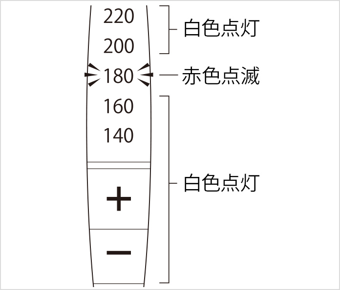• 温度表示ランプと「+」、「-」ランプが白色点灯し、設定温度※が赤色点滅します。