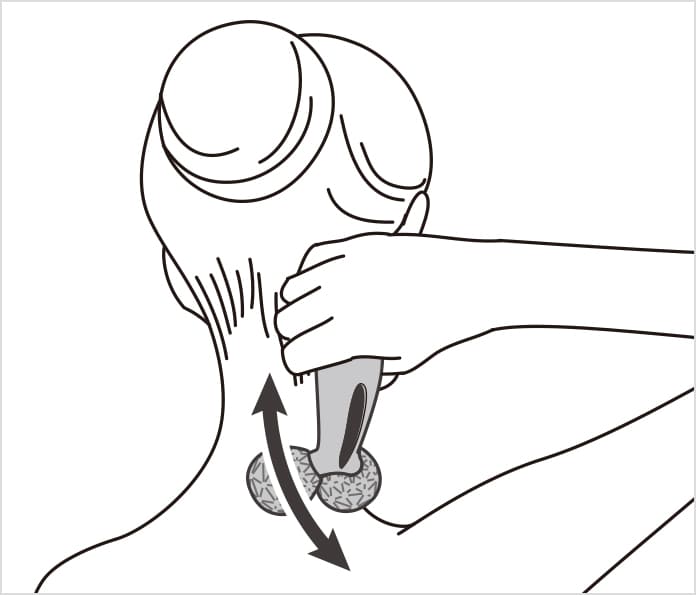 肩と首の付け根から頭に向かい、首筋に沿って上下にローリング。