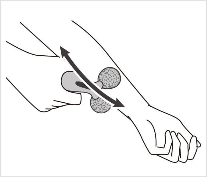 内側のひじ下を挟むように、手首からひじに向かってローリング。