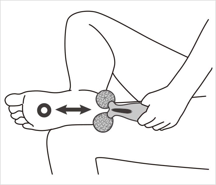 足の裏を全体的にローリング。仕上げに写真の○部分を片方のローラーでプッシュしましょう。