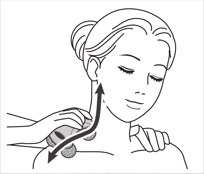 首の後ろの付け根から首筋に沿って肩まで上下にローリング。