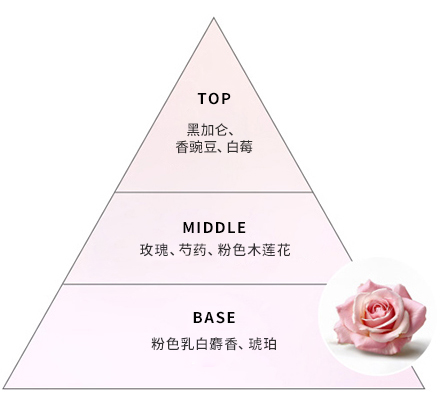 在玫瑰的娇美芬芳和香豌豆的柔和粉色花香中融合白莓的清新果香和白玉兰的清雅香味,