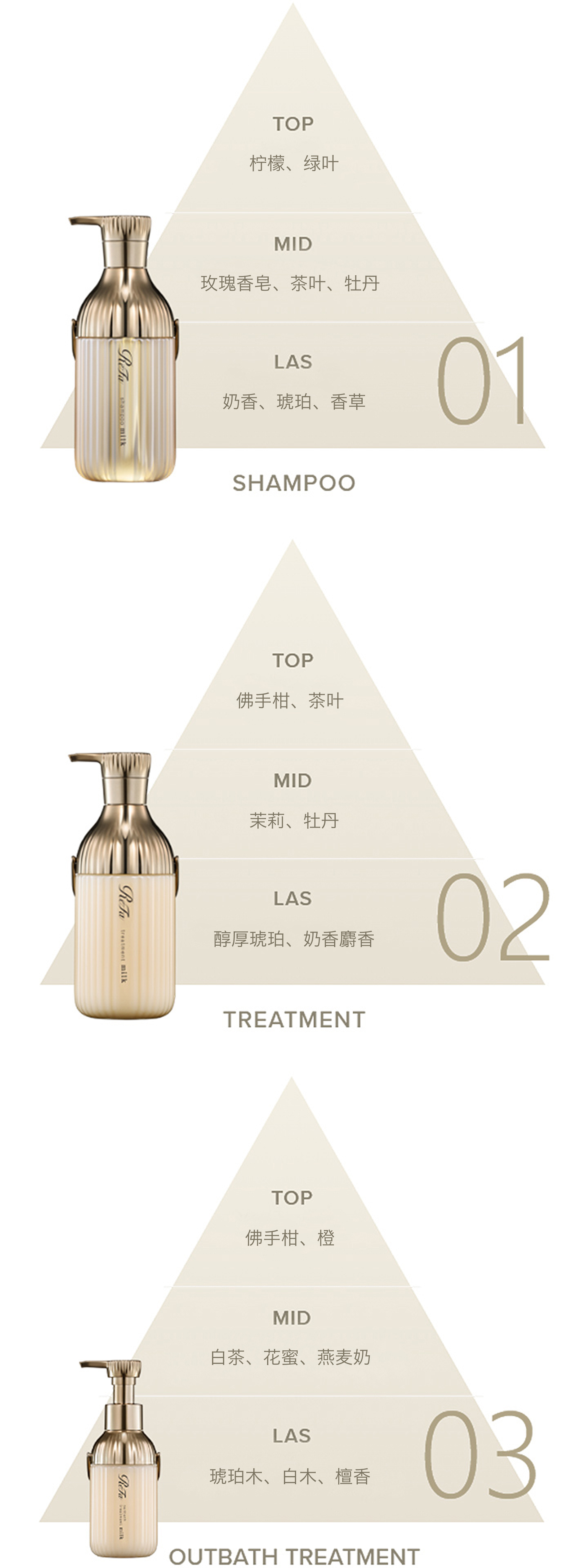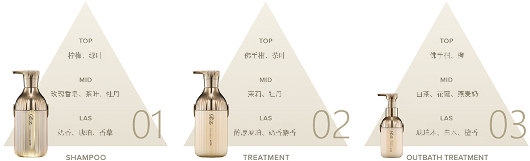 洗发水、护发素和免洗护发素,皆以琥珀为基调,散发各具特色的香气。佛手柑的清香、茶叶的雅致、茉莉的馥郁、牛奶的柔润与麝香的醇厚,层层叠加,谱出优雅与洗练的香氛旋律。作为系列中持香时间最长的产品,让你整天散发迷人魅力。