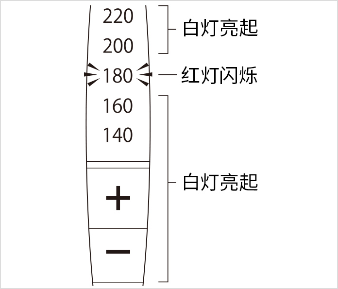 温度指示灯和“+”、“-”指示灯亮白灯,设定温度※指示灯为红灯闪烁。