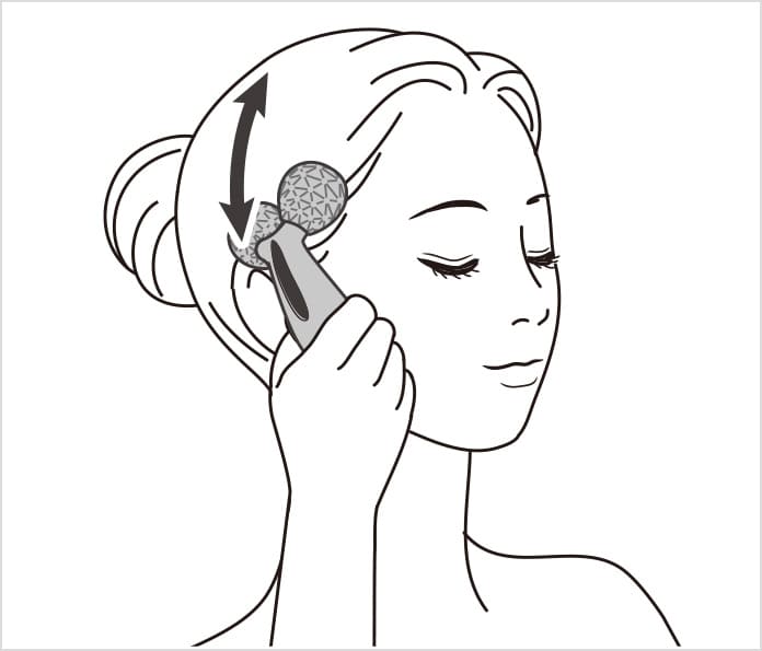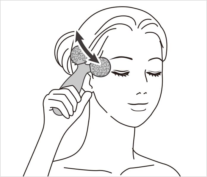 将单侧滚轮紧贴外眼角上方,沿着头部侧面滚动。